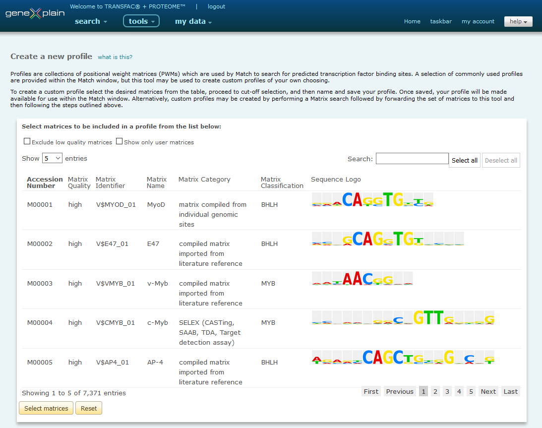You can get a matrix list for profile creation, either by directly searching for matrices using the main search options (optionally restricted to Matrix search) or by searching for Matrix via the respective custom search options. Alternatively, for a search result (e.g. based on an Ontology Search for tissue specificity, GO assignment, disease connection, etc) containing transcription factors, the list of matrices which are linked to these factors can be retrieved by using the "Search within results" with "Matrix" selected. For further details see the section on "Create Match profiles" here.