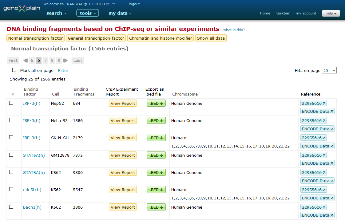 For each factor, the number of ChIP-chip/-Seq fragments contained in the database is presented, with information on genome and chromosomes of origin, cell source and reference links. ChIP-chip/-Seq fragments for one and the same factor, but derived from different experiments (different cell sources or treatments) are listed separately.